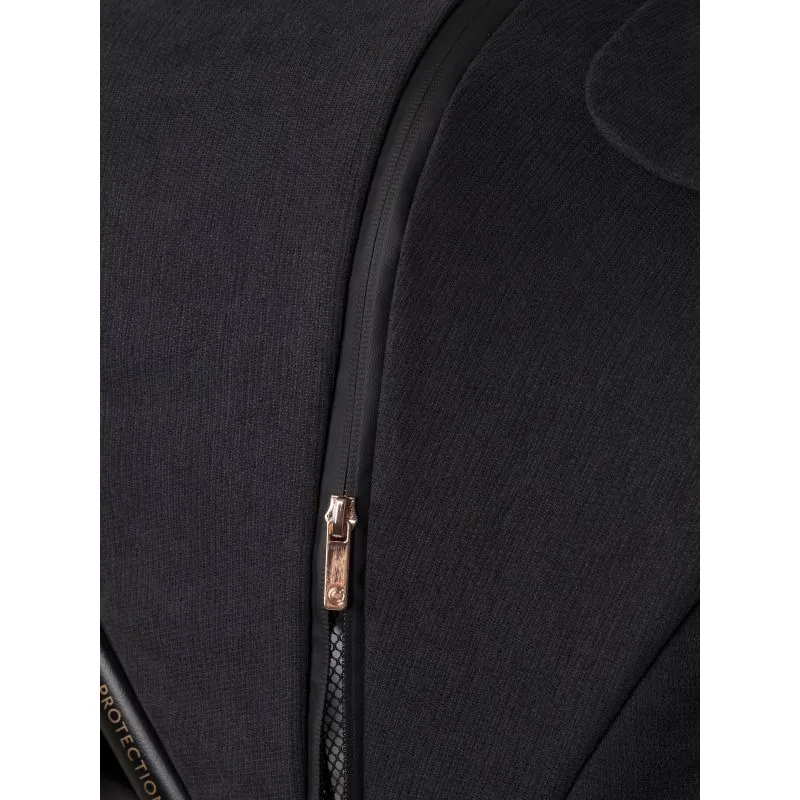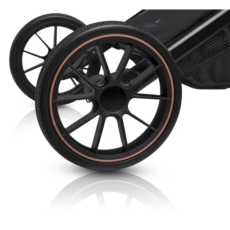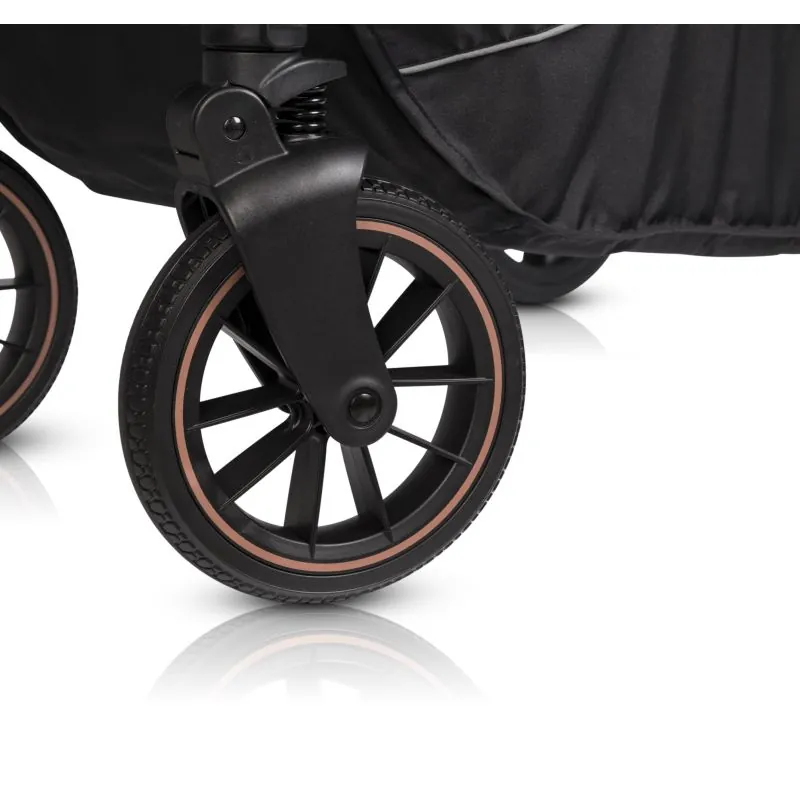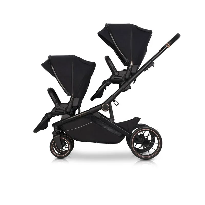 EN 1888: 2012 standarta atbilstības sertifikātsNoņemami sēdekļi (var uzstādīt uz priekšu un atpakaļ)Inovatīva aizmugures moduļa augstuma regulēšanas sistēma,Teleskopiska roktura augstuma regulēšana (vadotne),3 pakāpju atzveltnes regulēšana sēdekļos un regulējams kāju balstsLieli riteņi ar gultņiem un gumijas riepām (lieliska saķere arī uz sniega),Sēdekļi ar 5 punktu drošības jostām, piemēroti bērniem līdz 15 kgBuomeliai un rokturis pārklāti ar ekoloģisku āduLietus aizsardzība, kas aptver visu ratiņu apdari (atsevišķi katram sēdeklim)Tīkls pret kukaiņiem (atsevišķi katram sēdeklim)Kāju pārsegs (atsevišķi katram sēdeklim)Jumtiņos ir ventilācijas tīkliPašizlīdzinoši priekšējie riteņi ar iespēju bloķēt braucot taisni,Liels iepirkumu grozs zem ratiņiem (viegla piekļuve grozam, pateicoties atloka aizmugurē),Atstarojošs elements uz groza (labāka redzamība un drošība)Var atsevišķi iegādāties šūpuli, mammas somu un automašīnas sēdekli, kā arī adapterus.
