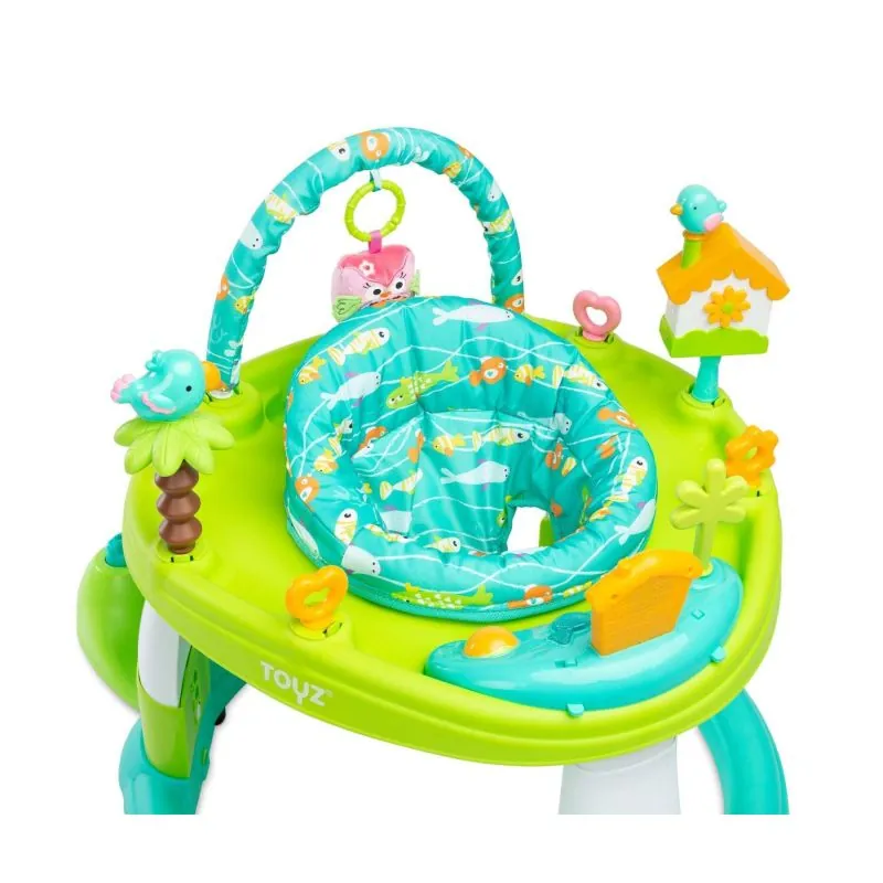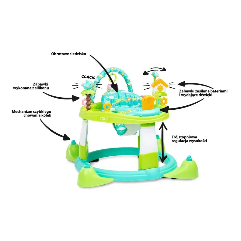 „Toyz Aloha“ ir staigulis ar izglītojoša galda funkciju, kas pieder produktu līnijai „Activity“, kas izceļas ar to, ka atbalsta bērna attīstību. Tāpēc staigulī „Aloha“ ir daudz rotaļlietu, kas ilgi aizraus jūsu bērnu. Interaktīvs panelis ar pogām.Plaša sensorisko rotaļlietu izvēle (grabules, čīkstošas un skanošas rotaļlietas).360 ° rotējošs sēdeklis ļaus jūsu mazulim viegli sasniegt visas rotaļlietas. Sēdeklis nodrošina pareizu bērna stāju lietošanas laikā.Staiguli var ātri pārvērst par galdu, izmantojot četras rokturus ar slēdzeni, kas atrodas uz riteņiem.Visi riteņi griežas, lai būtu ērti pārvietoties.3 soļu sēdekļa augstuma regulēšana (25 cm, 27 cm, 30 cm).Paredzēts bērniem no 6 mēnešiem līdz 12 kg.Atbilst EN 71 drošības prasībām.