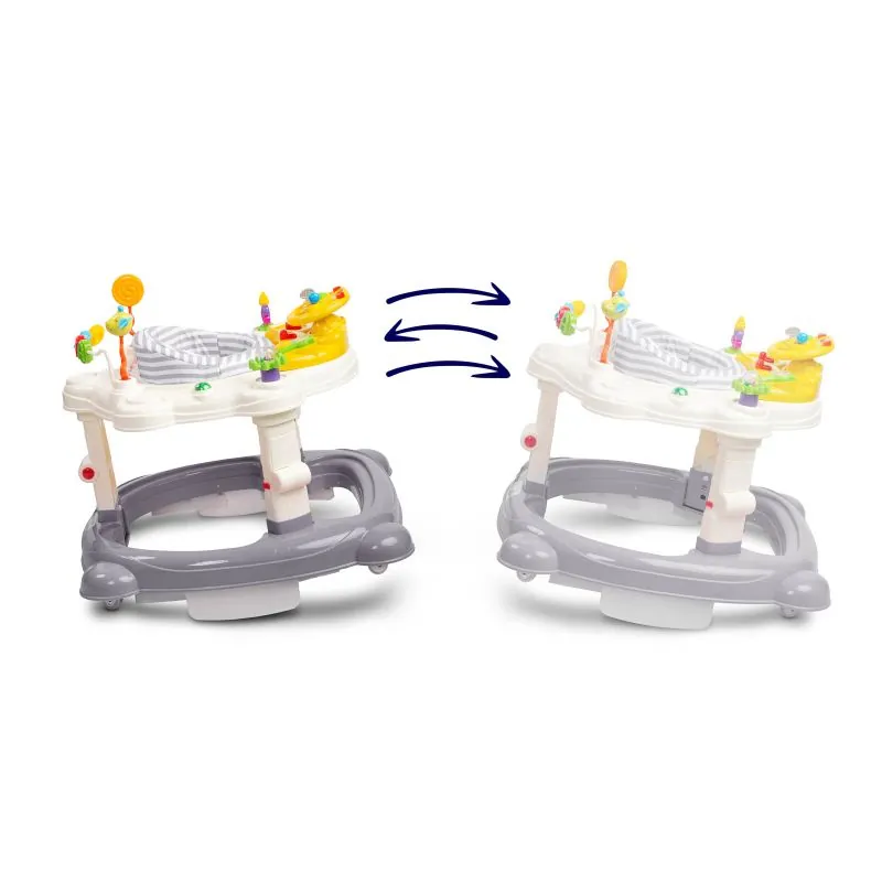 Staigulis izgatavots no augstas kvalitātes plastmasas. Ar 360 grādu rotējošu sēdekli un rotaļīgu izglītojošu galdiņu