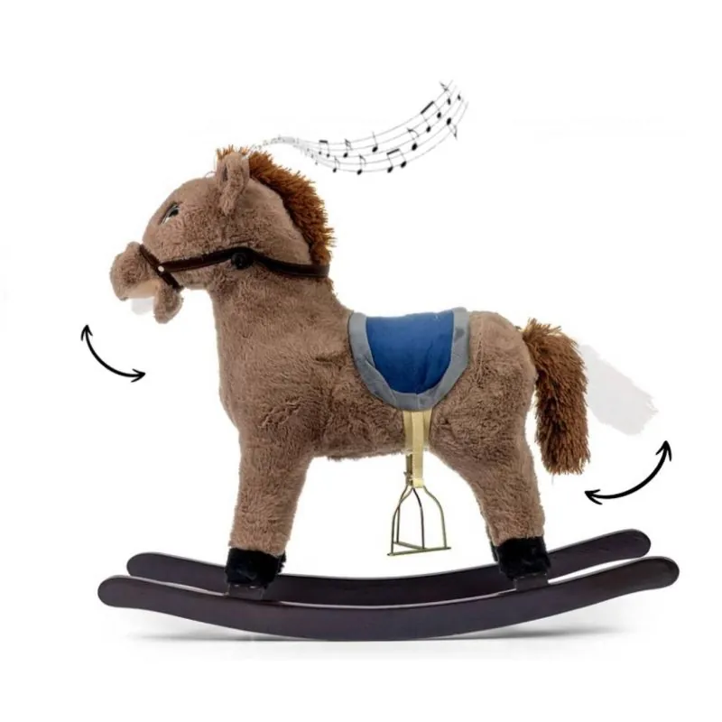 Mīksts šūpojošs zirgs - par šādu rotaļlietu sapņo katrs bērns, bez tradicionālās šūpošanās funkcijas tam ir daudz papildu jautru funkciju;Zirgam ir koka šūpoles un rokturi, kas palīdzēs saglabāt līdzsvaru spēlējoties;Izgatavots no mīksta un maiga plīša materiāla;Spēlējoties bērnam ir jāsaskaņo savas kustības ar zirgu, tas veicina viņa motorisko koordināciju, attīsta iztēli, uzlabo līdzsvara sajūtu; Zirgs ātri kļūs par jūsu bērna pirmo spēļu draugu; Kustina asti;Kustina muti;Izstaro skaņas;Izgatavots no mīksta plīša;Segli ar kāpšļiem;Koka rokturi un šūpoles;Maksimālā slodze: 30 kg.;No 18 mēnešu vecuma;Barošana: 3 x AA; PRECES IZMĒRI:Garums: 74 cm.;Augstums: 58 cm.;Platums: 28 cm.;Sēdekļa augstums: 41 cm.;Neto svars: 2 kg.