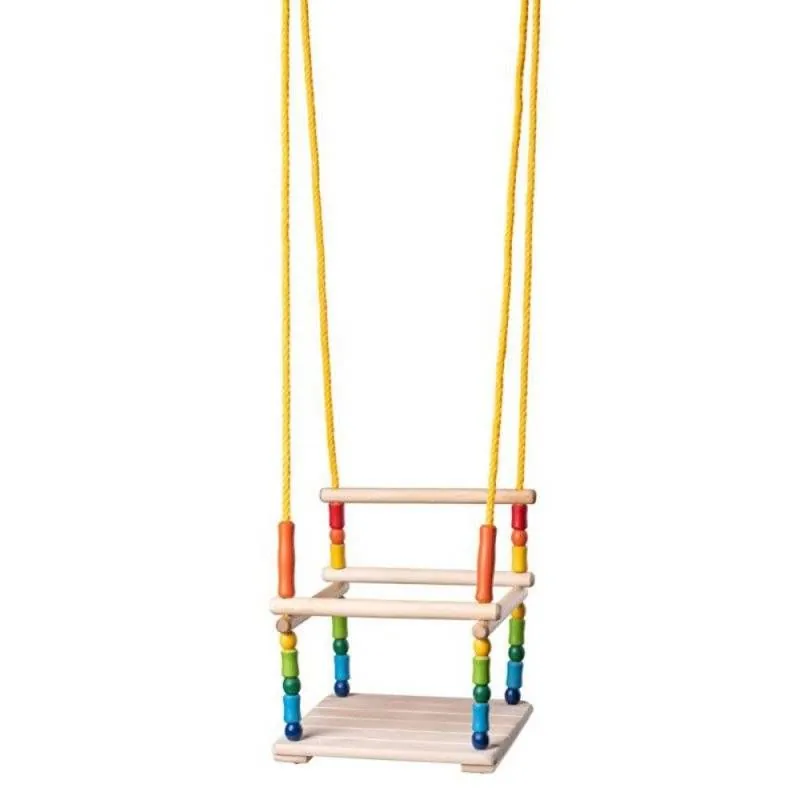 Krāsainas koka šūpoles bērniem. Izgatavotas no dabīga koka, izturīgas un drošas bērniem. Aizmugurē atzveltne ir nedaudz augstāka, lai bērni neizkristu šūpojoties.Šīs šūpoles var izmantot gan ārā, gan iekštelpās.Maksimālais svars 35 kg.Garums 160 x 220 cm.Sēdvietas izmēri: 30 x 30 x 32 cm.