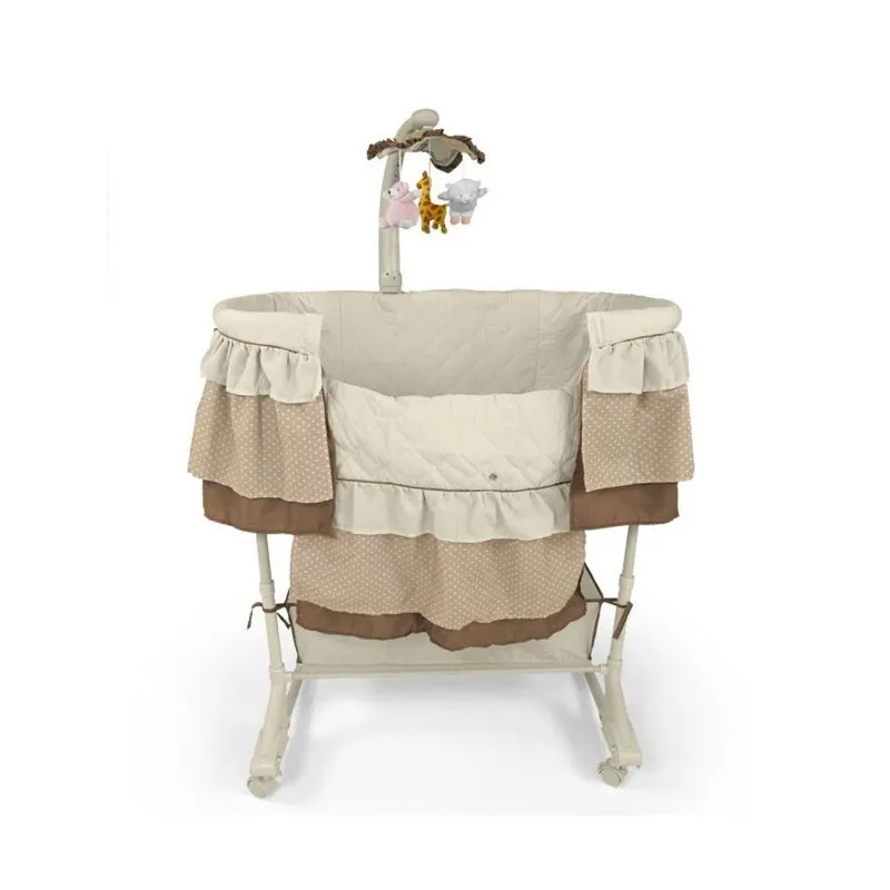 Šūpuļa šūpoles ir riteņi, kurus var viegli bloķēt.4 pozīciju augstuma regulēšana.Sānu sienas augstuma regulēšana vieglai autiņbiksīšu maiņai.Paslēpjot riteņus, var šūpoties.Noņemams baldahīns.Karuselis ar plīša rotaļlietām un elektronisko moduli (vibrācijas, melodijas, lampa).Noņemams pārvalks mazgāšanai.Stepēta iekšējā odere.Vinila matracis.Papildu kabata autiņbiksītēm.Grozs mazuļa vajadzībām.Izmēri: garums 87 cm, platums 47 cm, dziļums 27 cm.