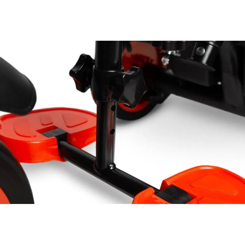 Šis modelis ir īpašs ar to, ka sēdēšanai paredzētais krēsls var griezties ap savu asi, tāpēc bērns var sēdēt un skatīties ne tikai uz priekšu, bet arī atpakaļ.Ergonomiska pieskārienam mīksta stumšanas un vadības rokturis;Saules aizsargs;Stūre ar mīkstiem aizsargiem;Mīksts aizsargs ap sēdekli;Augsts sēdekļa atzveltne;Polipropilēna riepas;Ērts auduma groziņš rotaļlietām un citām sīkumiem;Kāju balsts ar dubultu saliekšanas mehānismu;Plati lieli riteņi: priekšējais - 24 cm, aizmugurējie - 20 cm;Trīsriteņa izmēri: 102x101x39 cm.