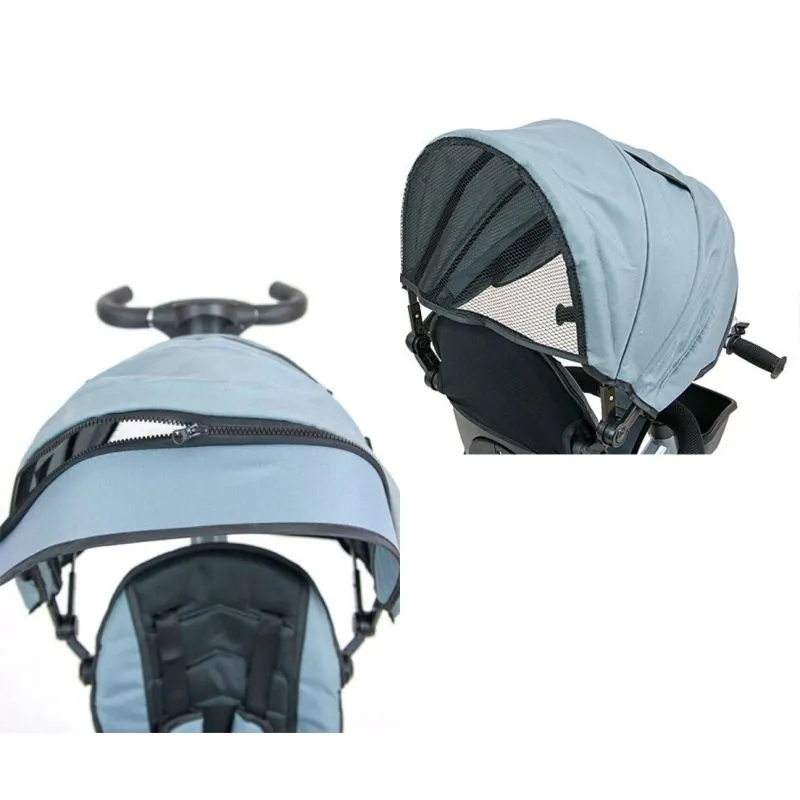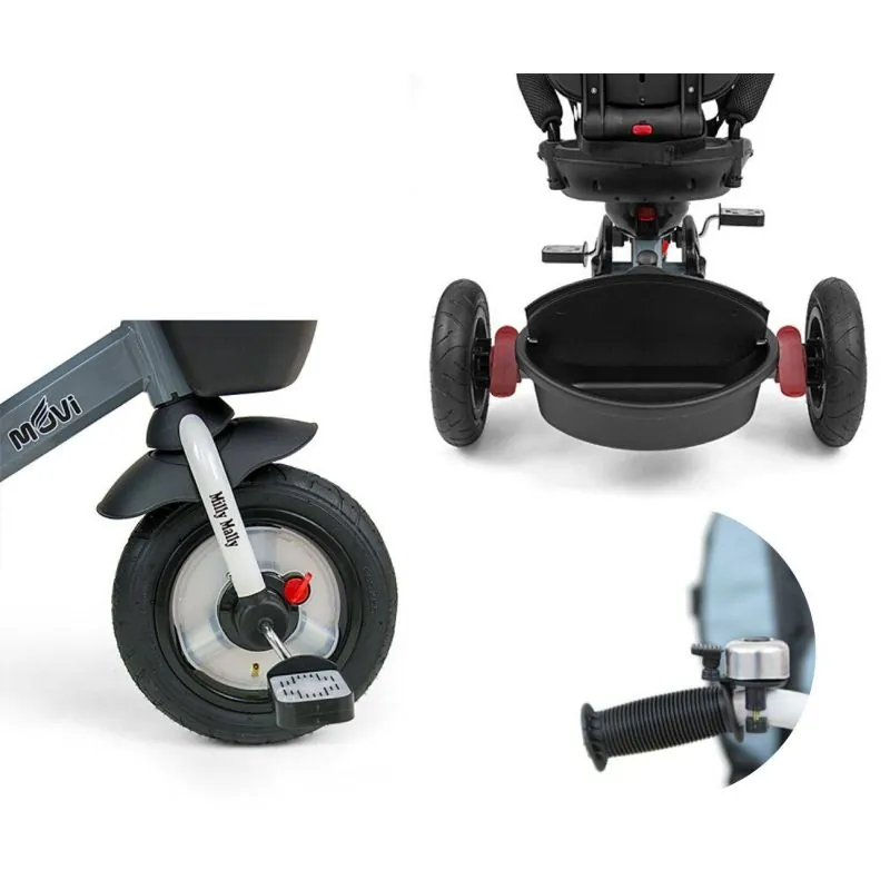 360 grādu leņķī pagriežams sēdeklis.Trīsriteņa vadība ar stumšanas rokturi.Brīvās gaitas funkcija.Trīs pakāpju stumšanas roktura augstuma regulēšana.Trīs punktu drošības jostas ar pārvalkiem, kas aizsargā rokas.Ērts, profilēts sēdeklis ar divu pakāpju regulējamu atzveltni.Noņemams sēdekļa pārvalks.Jumtiņš ar tīklu, kas ļauj novērot bērnu.Noņemams jumtiņš ar rāvējslēdzēju.Piepūšamie riteņi.Tērauda rāmis.Pedāļi pie priekšējā riteņa.Priekšējam ritenim ir aizsargvāks, lai kājas neiesprūstu.Papildu platforma kājām mazākiem bērniem, kas piestiprināma pie sēdekļa.Soma ar vāku sīkumiem aizmugurē.Mazs groziņš priekšā.Krūzes / pudeles turētājs.Viegli tīrāms, noņemams aizsargbarjers.Salokāms kāju balsts.Gumijas, neslīdošas rokturi ar pārvalkiem.Aizmugurējie riteņi ar lodīšu gultņiem.Aizmugurējā riteņa bloķētājs..Piemērots bērniem 1-5 gadi.Atbilst Eiropas drošības standartiem.