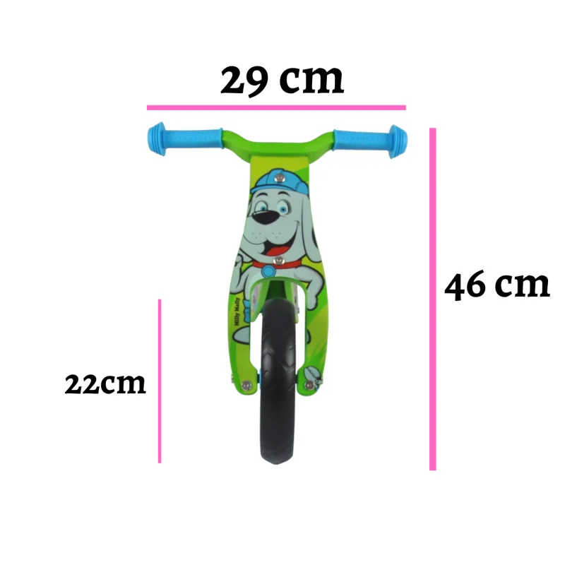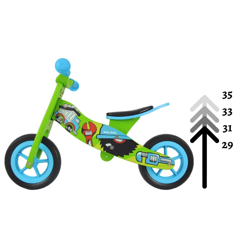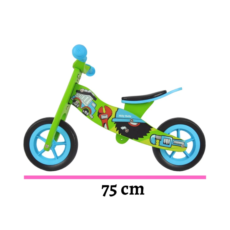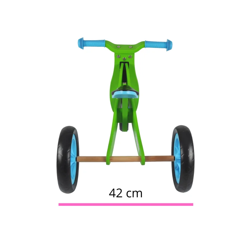 Velosipēds izgatavots no izturīga koka.Stūres apstāšanās.Neslīdoši rokturi.9" putuplasta riteņi.4 sēdekļa augstuma regulēšanas līmeņi.Vienkārši gultņi.Divu funkciju (trīsritenis vai divritenis).Maksimālā slodze 25 kg.Piemērots vecums: 18-36 mēneši.Atbilst Eiropas drošības standartiem.