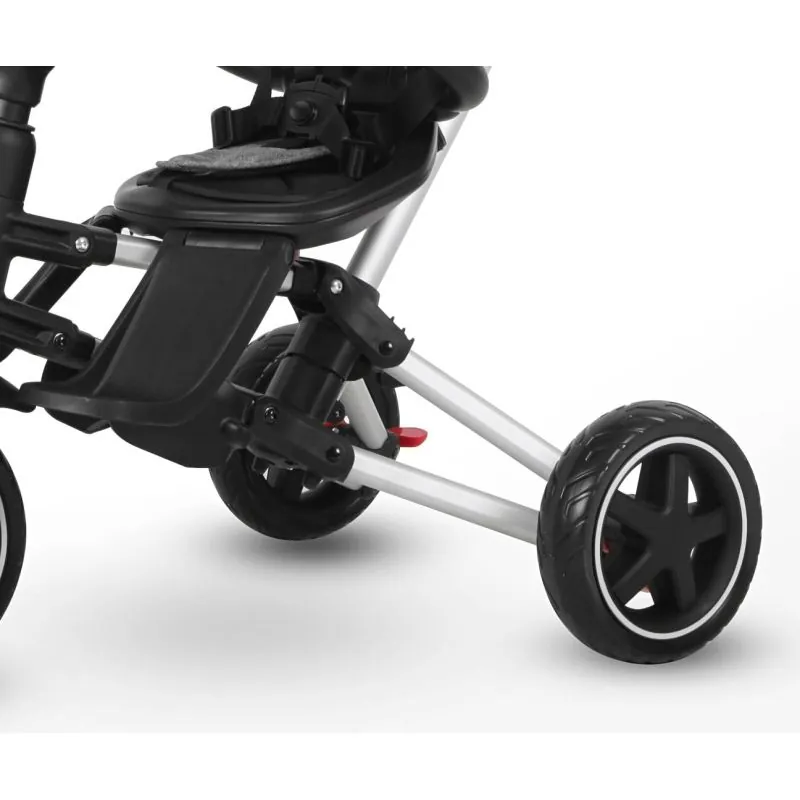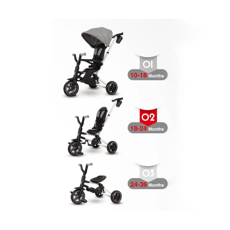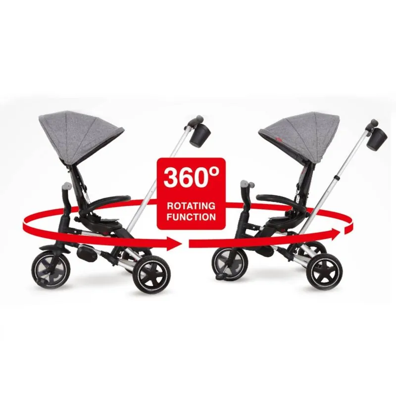 Skats uz vecākiem režīms.Skats uz pasauli režīms.Atzveltnes režīms.Pašbraukšanas režīms.Piemērots 24-72 mēnešiem.Bērna svara ierobežojums: 25 kg.Viegls, tikai 6,9 kg.360 grādu rotējošs sēdeklis uzlabo mijiedarbību.Atzveltnes regulēšana bērna ērtībai.Stumšanas stieņa augstuma regulēšana vecākiem.5 punktu drošības jostu sistēma.2 veidu kāju balsts, kas lieliski piemērots jebkuram vecumam.EVA riteņi.UPF30 jumtiņš, kas nodrošina pilnīgu aizsardzību.Viena poga pilnīgai salocīšanai un vieglai uzglabāšanai.Aizmugurējās kāju bremzes, kas nodrošina, ka trīsritenis stāv uz vietas.Stūres sajūga sistēma, lai aizsargātu jūsu bērnu.Aprīkots ar krūzīšu turētāju aizmugurē.