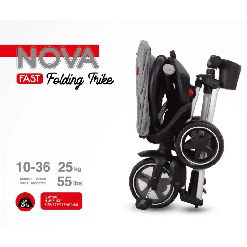 Grezns trīsritenis ir ar alumīnija rāmi. Sēdeklis var tikt pagriezts par 360 grādiem, tāpēc jūs varat izvēlēties, kā sēdēs jūsu bērns. Atzveltne ir regulējama, lai būtu ērtāk. NOVA trīsritenis ir ar aizmugurējo riteņu bremzēm un EVA riteņiem. Ar stūri un citām iespējām, piemēram, stūres stiprinājumu, vecāki var viegli stumt NOVA trīsriteni. Atzveltni un stūri var izjaukt, tāpēc jūsu bērns var doties piedzīvojumos ar "parastu" trīsriteni.