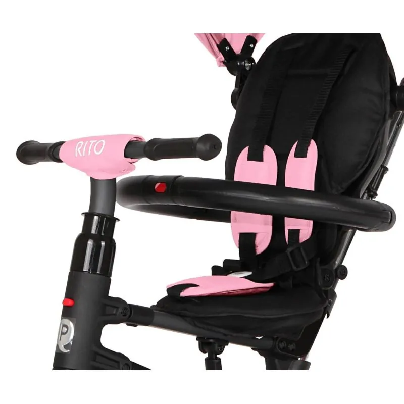 Piemērots bērniem no 1 līdz 3 gadiem, līdz 25 kg.Izturīgs rāmis.Kvalitatīvi audumi, izturīgi pret mitrumu.Mīksti Eva putu riteņi.Salokāms kāju balsts.Polsterēts sēdekļa pārvalks.5 punktu drošības jostas ar polsterētām spilventiņiem.Regulējams saules jumtiņš, ar iespēju pilnībā noņemt.Pedāļus var bloķēt, lai bērns min, bet neietekmē braukšanu, vai atbloķēt, lai bērns pats min trīsriteni.Stūri var bloķēt, lai bērns nevarētu vadīt, un trīsritenis brauktu tikai taisni.Stumšanas rokturis ar regulējamu augstumu. Kad bērns izaug, to var pilnībā noņemt.Transportēšanas laikā stumšanas stūri var salocīt.Izmēri: 83 x 53 x 108 cm.Salikto izmēri: 47,5 x 46 x 88 cm.Svars 9.7 kg.