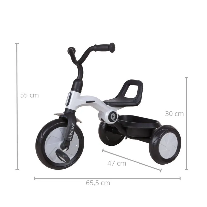 Izturīgs metāla rāmis ir izturīgs un izturīgs, ar regulējamu augstuma sēdekli, lai augtu kopā ar bērnu.EVA riteņi ir viegli, tāpēc lieliski piemēroti piedzīvojumiem ārā.„Q Play Ant“ saliekamais trīsritenis ir kompakts, lai to būtu ērti uzglabāt.Ātri salokāms.Pārnēsāšanas rokturis, lai varētu ņemt līdzi ceļojumā.Liels maiss ļauj bērniem ņemt līdzi iecienītākās rotaļlietasLūdzu, ņemiet vērā, ka šim priekšmetam nav drošības jostas.Izmēri: 67,5 x 46 x 54 cm