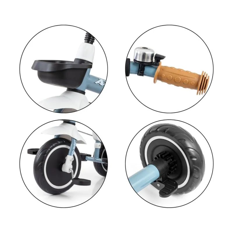 AXEL trīsritenim ir noņemams vecāku rokturis un grozs priekšmetiem;