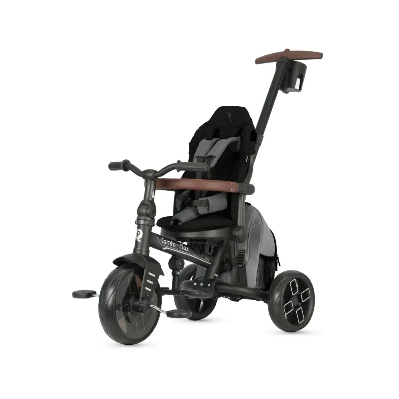 Kamēr bērns iemācās patstāvīgi vadīt un kontrolēt trīsriteni, vecāki stumjot trīsriteni regulēs braukšanas virzienu.