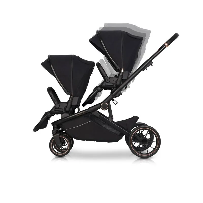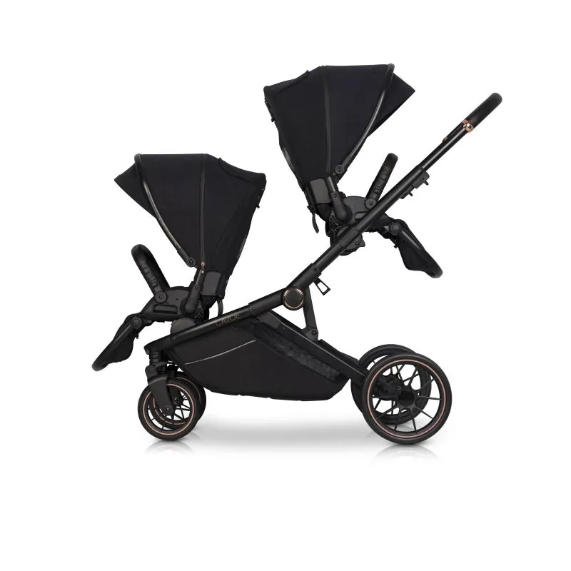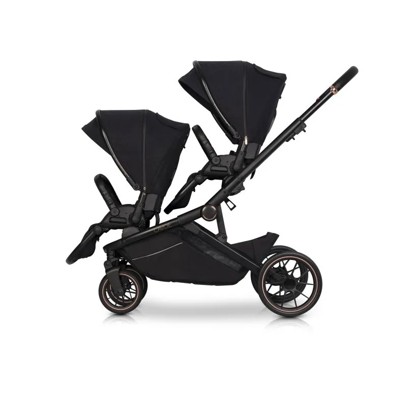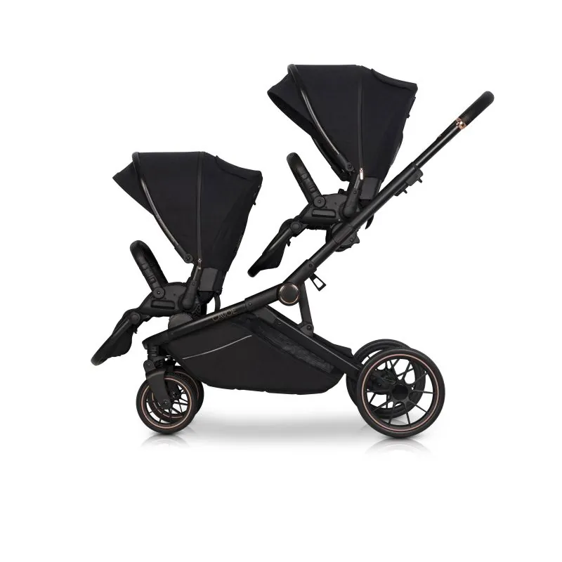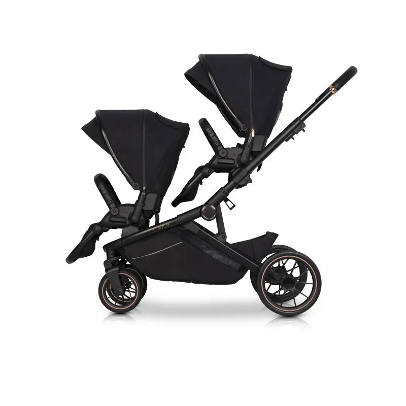 EN 1888: 2012 standarta atbilstības sertifikātsNoņemami sēdekļi (var uzstādīt uz priekšu un atpakaļ)Inovatīva aizmugurējā moduļa augstuma regulēšanas sistēma,Teleskopiska roktura augstuma regulēšana (vadītājs),3 pakāpju atzveltnes regulēšana sēdekļos un regulējams kāju balstsLieli riteņi ar gultņiem un gumijas riepām (lieliska saķere arī uz sniega),Sēdekļi ar 5 punktu drošības jostām, piemēroti bērniem līdz 15 kgBuferi un rokturis pārklāti ar ekoloģisku āduLietus aizsargs, kas pārklāj visu ratiņu apdari (atsevišķi katram sēdeklim)Tīkls pret kukaiņiem (atsevišķi katram sēdeklim)Kāju pārsegs (atsevišķi katram sēdeklim)Jumtiņos ir ventilācijas tīkliPašizlīdzinoši priekšējie riteņi ar iespēju bloķēt, braucot taisni,Liels iepirkumu grozs zem ratiņiem (viegla piekļuve grozam, pateicoties atloka aizmugurē),Atstarojošs elements uz groza (labāka redzamība un drošība)Var atsevišķi iegādāties šūpuli, māmiņas somu un automašīnas sēdekli, kā arī adapterus.