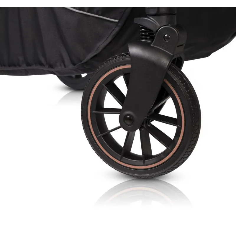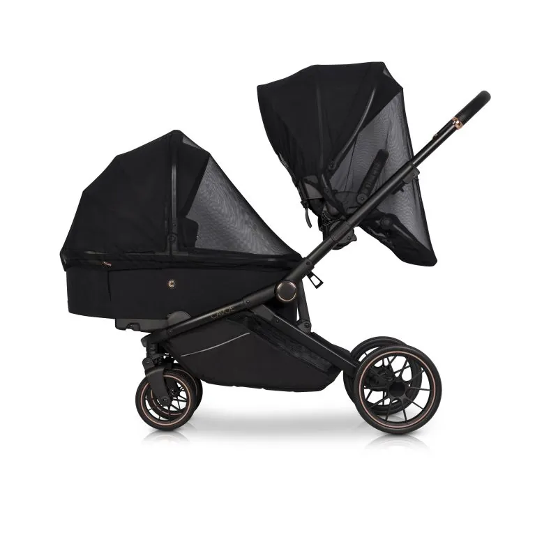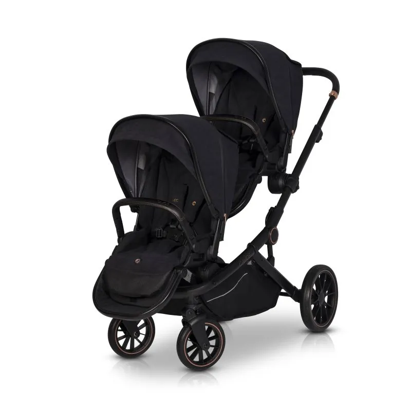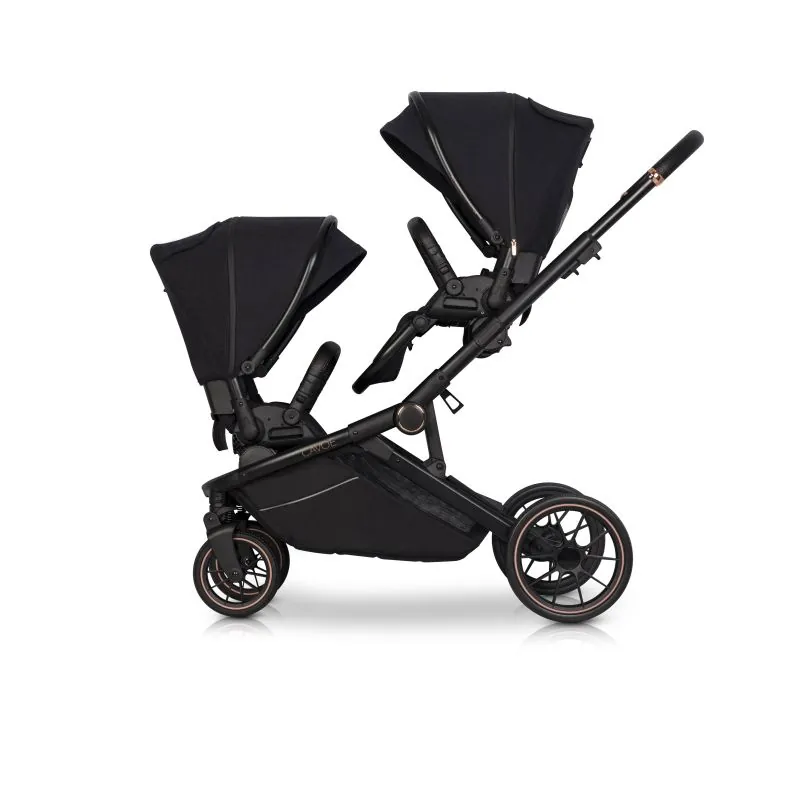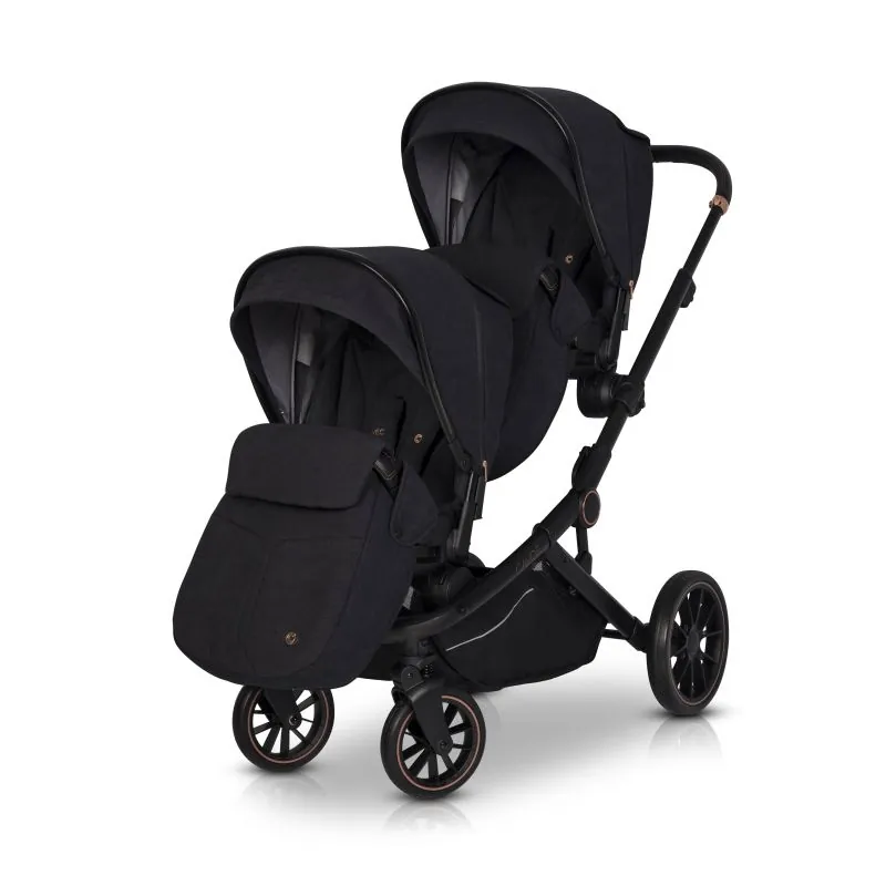 EN 1888: 2012 standarta atbilstības sertifikātsNoņemami sēdekļi (var uzstādīt uz priekšu un atpakaļ)Inovatīva aizmugurējā moduļa augstuma regulēšanas sistēma,Teleskopiska roktura augstuma regulēšana (vadītājs),3 pakāpju atzveltnes regulēšana sēdekļos un regulējams kāju balstsLieli riteņi ar gultņiem un gumijas riepām (lieliska saķere arī uz sniega),Sēdekļi ar 5 punktu drošības jostām, piemēroti bērniem līdz 15 kgBuferi un rokturis pārklāti ar ekoloģisku āduLietus aizsargs, kas pārklāj visu ratiņu apdari (atsevišķi katram sēdeklim)Tīkls pret kukaiņiem (atsevišķi katram sēdeklim)Kāju pārsegs (atsevišķi katram sēdeklim)Jumtiņos ir ventilācijas tīkliPašizlīdzinoši priekšējie riteņi ar iespēju bloķēt, braucot taisni,Liels iepirkumu grozs zem ratiņiem (viegla piekļuve grozam, pateicoties atloka aizmugurē),Atstarojošs elements uz groza (labāka redzamība un drošība)Var atsevišķi iegādāties šūpuli, māmiņas somu un automašīnas sēdekli, kā arī adapterus.