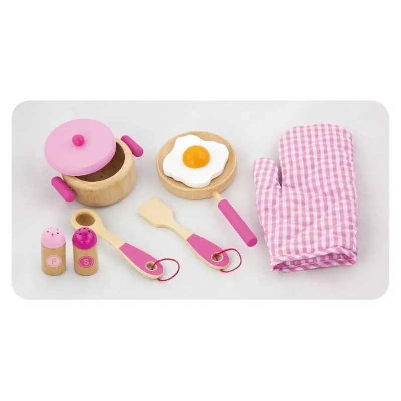 Rozā, koka cepšanas komplekts:Cepšanas lāpstiņas, kausiņš, katls ar vāku, panna ar olu, 2 garšvielu trauciņi,cepeškrāsns cimds. Lieliski sader ar "Viga" virtuvi vai kā atsevišķa virtuves rotaļlieta. Jaunie pavāri bieži vēlas palīdzēt vecākiem virtuvē, tāpēc tagad viņi varēs gatavot ēdienus kā īsti pieaugušie.