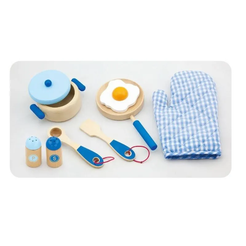 Zils, koka cepšanas komplekts:cepšanas lāpstiņas,karote, katls ar vāku,panna ar olu,2 garšvielu trauciņi,cepeškrāsns cimds.Lieliski sader ar "Viga" virtuvi vai kā atsevišķa virtuves rotaļlieta.Jaunie pavāri bieži vēlas palīdzēt vecākiem virtuvē, tāpēc tagad viņi varēs gatavot ēdienus kā īsti pieaugušie.Spēlējiet ar "Viga" rotaļlietām, kas palīdz jūsu bērnam attīstīt loģisko domāšanu un motoriskās prasmes.