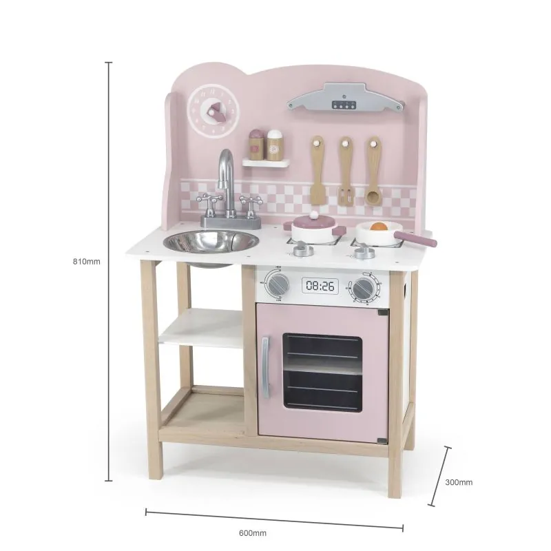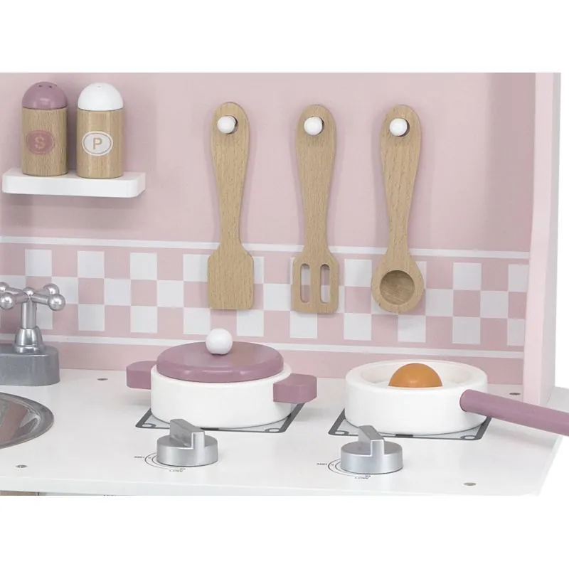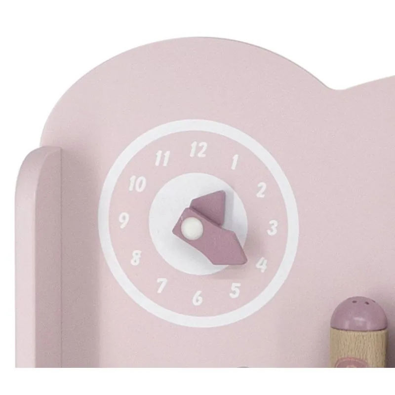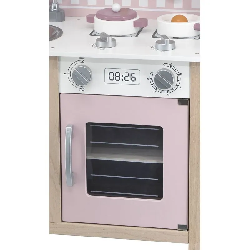 Virtuvē ir izlietne, cepeškrāsns un plīts, kurā bērns varēs pagatavot iecienītus ēdienus visai ģimenei.Virtuvē ir visi nepieciešamie piederumi: katls ar vāku, panna ar ceptu olu, karote, caurumota lāpstiņa, trauciņi ar sāli un pipariem.Virtuves pulkstenis ļauj bērnam kontrolēt laiku ēdiena gatavošanā.4 grozāmi rokturi.Pēc ēdiena gatavošanas bērns var mazgāt traukus izlietnē un atkal gatavot.Spēlējot bērns iemācās būt atbildīgs par savu nekārtību un tīrīšanu.