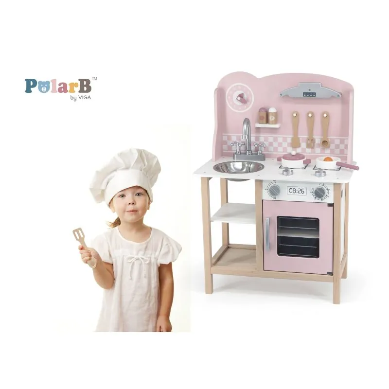 Bērnu koka virtuvīte, kas pielāgota mazajam virtuves šefam spēlēties.