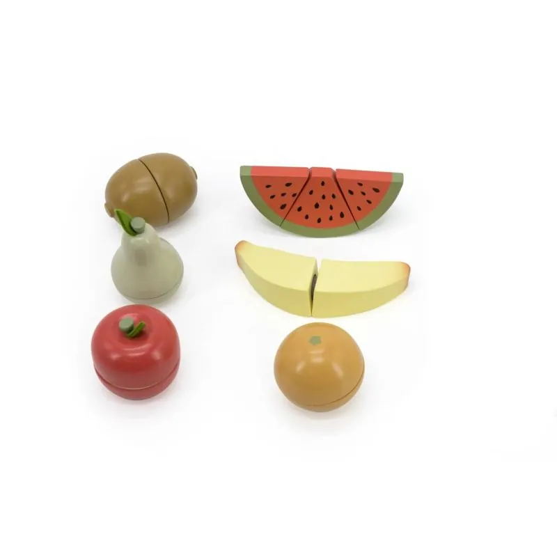 Lieliska rotaļlieta, kas rosina jūsu bērna iztēli;Šīs koka rotaļlietas, kas veidotas kā dažādi augļi, var izmantot arī kā vizuālos līdzekļus grupu aktivitātēs un mājās;Kamēr vecāki gatavo maltīti visai ģimenei, mūsu mazais pavārs vai pavāre sagatavos augļu salātus ar iecienītākajiem piedevām savām lellēm un lācīšiem;Pateicoties drošajam koka nazim, bērni var viegli "sagriezt" arbūzu, banānu vai apelsīnu;Spēlējot kopā, vecāki var iemācīt saviem bērniem, kā nākotnē izmantot asus virtuves rīkus;Papildu priekšrocība ir tā, ka visi produkti ir savienoti ar "Velcro" uzlīmēm, nodrošinot nebeidzamu izklaidi;Visi tie izskatās izsmalcināti un reālistiski. Sagriežot tos, var atkal savienot;Dārzeņu griešanas dēļu komplekts patiks pirmsskolas vecuma zēniem un meitenēm;Koka augļi var dažādot lomu spēles, papildināt spēļu virtuves un palīdzēt bērniem apgūt vienkāršu ēdienu gatavošanu;Bērni kļūst komunikabli, radošāki un pārliecinātāki par sevi;Šis komplekts attīsta sociālās prasmes, attīsta smalko motoriku, domāšanu un iztēli;
