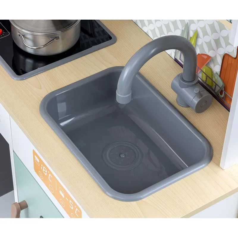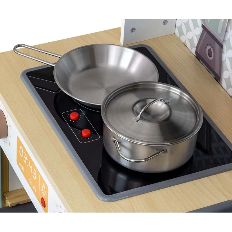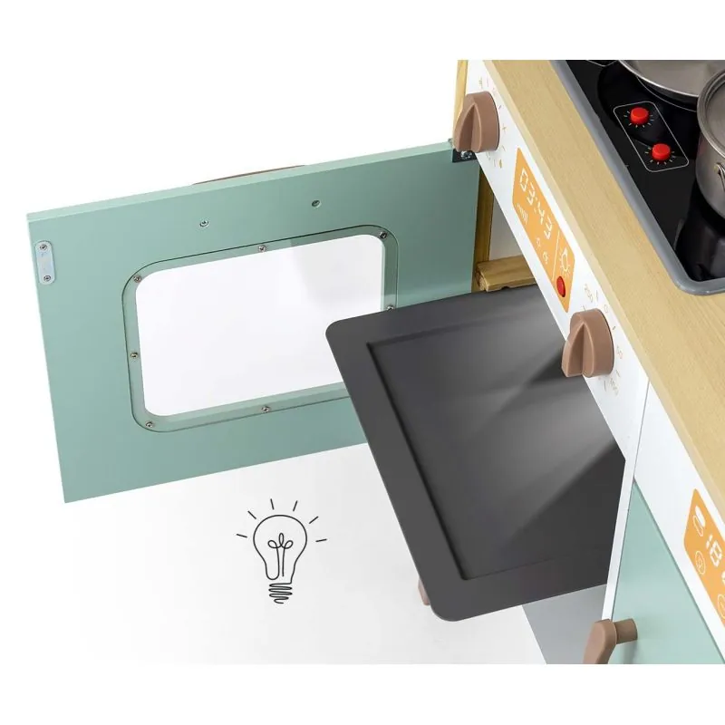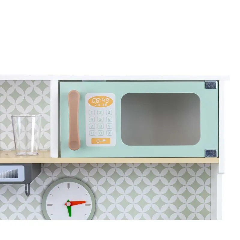 Pasteļu krāsu koka virtuvīte ar virtuves piederumu komplektu. Ieteicams bērniem no 3 gadu vecuma.