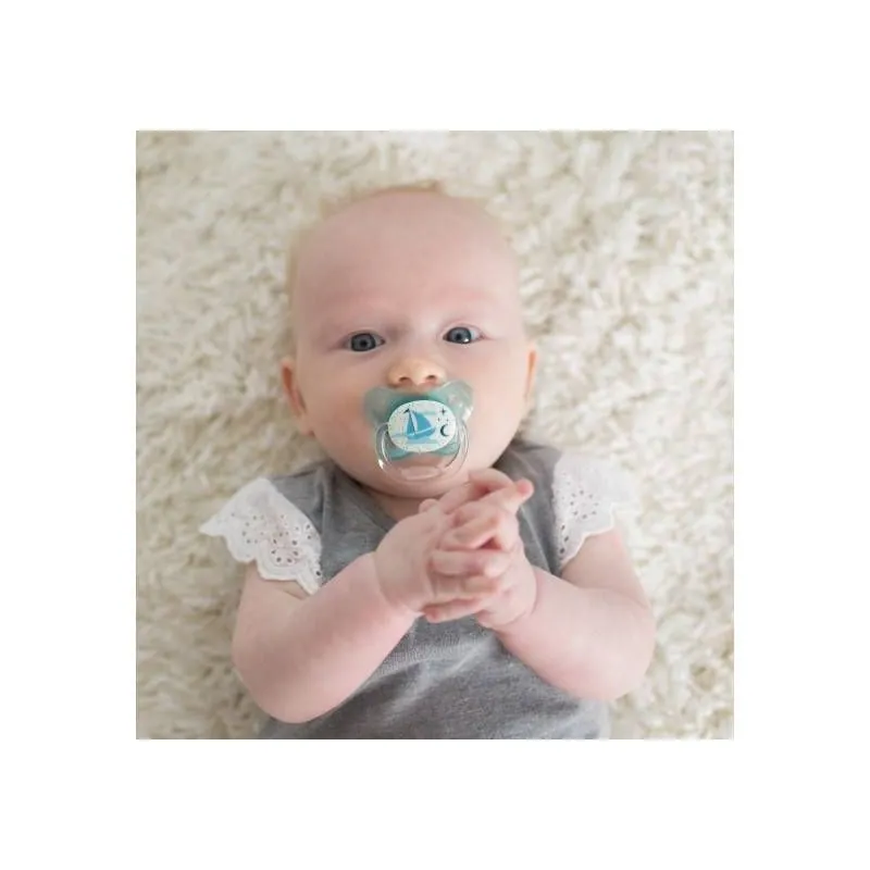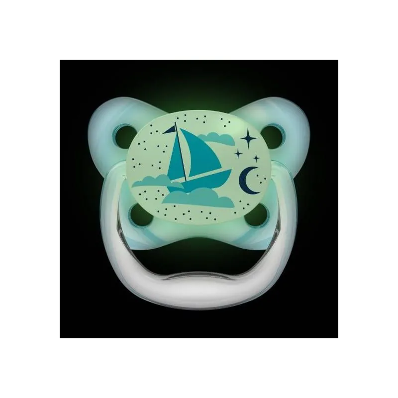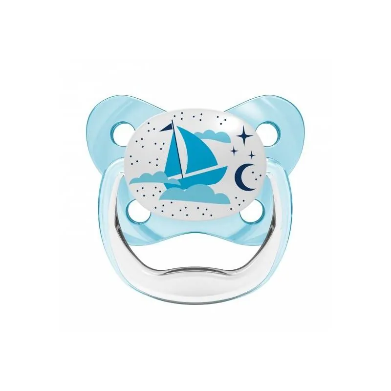 Zīdaiņa galviņa tumsā spīd, tāpēc zīdaini ir ērti atrast naktī gultiņā. Mīksts, nesaraujošs, ar patentētu gaisa kanālu, kas samazina spiedienu uz aukslējām bērnam zīžot. Izstrādāts bērnu zobārsta. Ļoti plāns, minimāli ietekmē bērna muti, samazina nepareiza sakodiena iespējamību. Piemērots mutes attīstībai un mēles pozīcijai. Īpaša tauriņa forma nodrošina vaigiem un degunam lielāku komfortu. Bez bisfenola BPA.