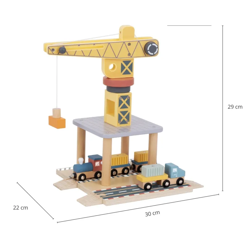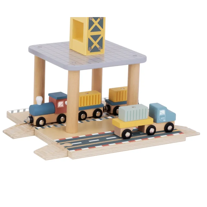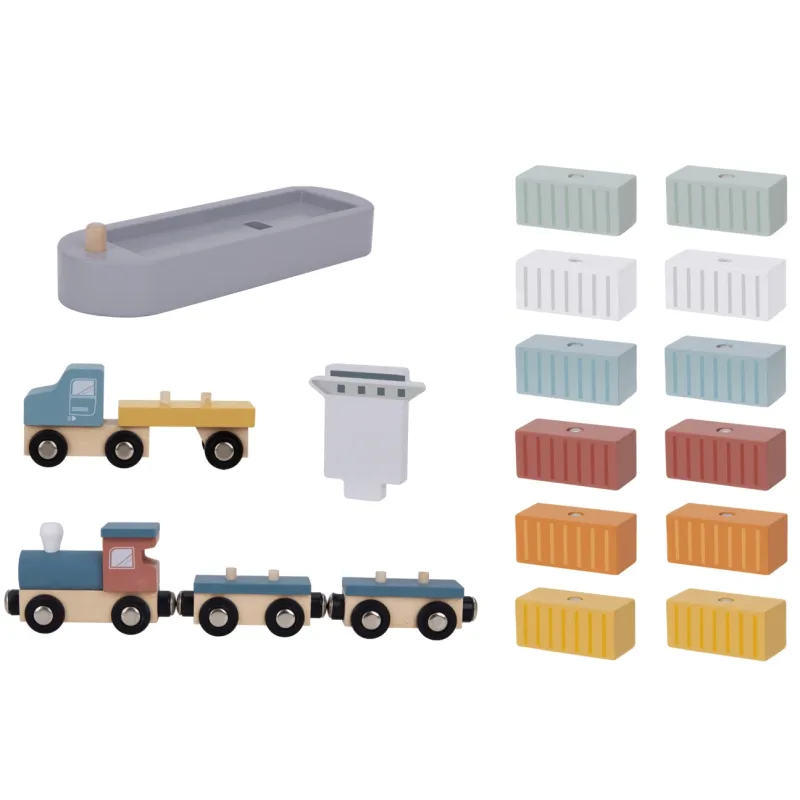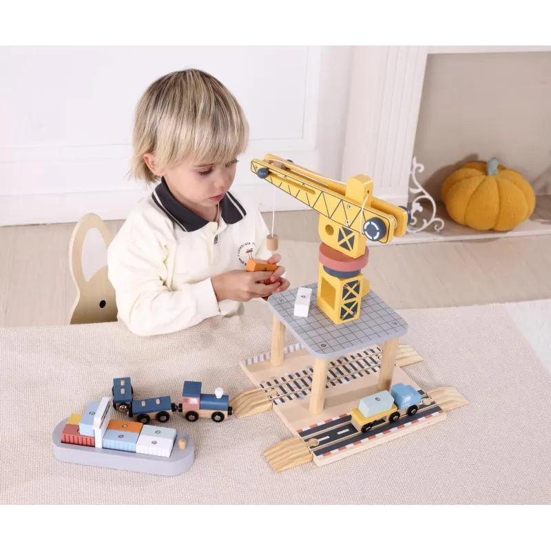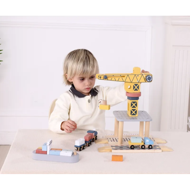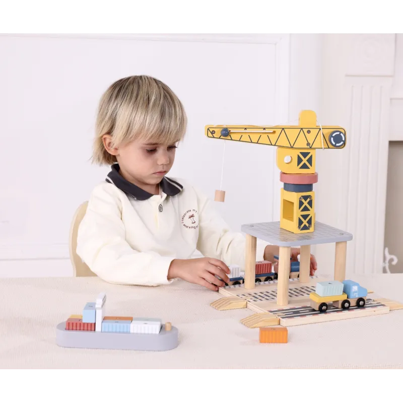 Medinės jūrinės pakrovimo stoties rinkinys yra unikalus edukacinis žaislas vaikams nuo 3 metų, sudarytas iš 24 dalių.